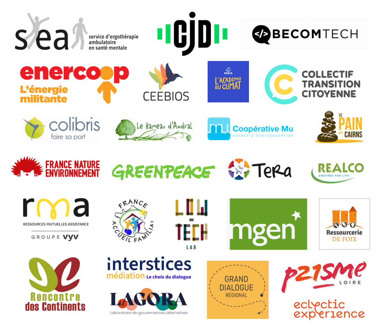 Merci à : CJD Centre des Jeunes Dirigeants et le parcours Galilée, Becomtech, Enercoop, Ceebios, Vent de Terre, CTC Collectif Transition Citoyenne, Le Mouvement Colibris, le Hameau d'Andral, Coopérative MU, le Pain des Cairns, France Nature Environnement, Greenpeace, TERA, Realco, RMA, Planing Familial, Low Tech Lab, MGEN, Ressourcerie de Foix, Rencontre des Continents, Interstices Médiation, LAGORA, le Grand Dialogue, Prisme 21, Eclectic expérience, SOS Femmes 93, Les chantiers de demain, Vyv Écoute&Solutions, Ecole Arbres en Ciel, Reporterre et 73 autres collectifs ou organisations !